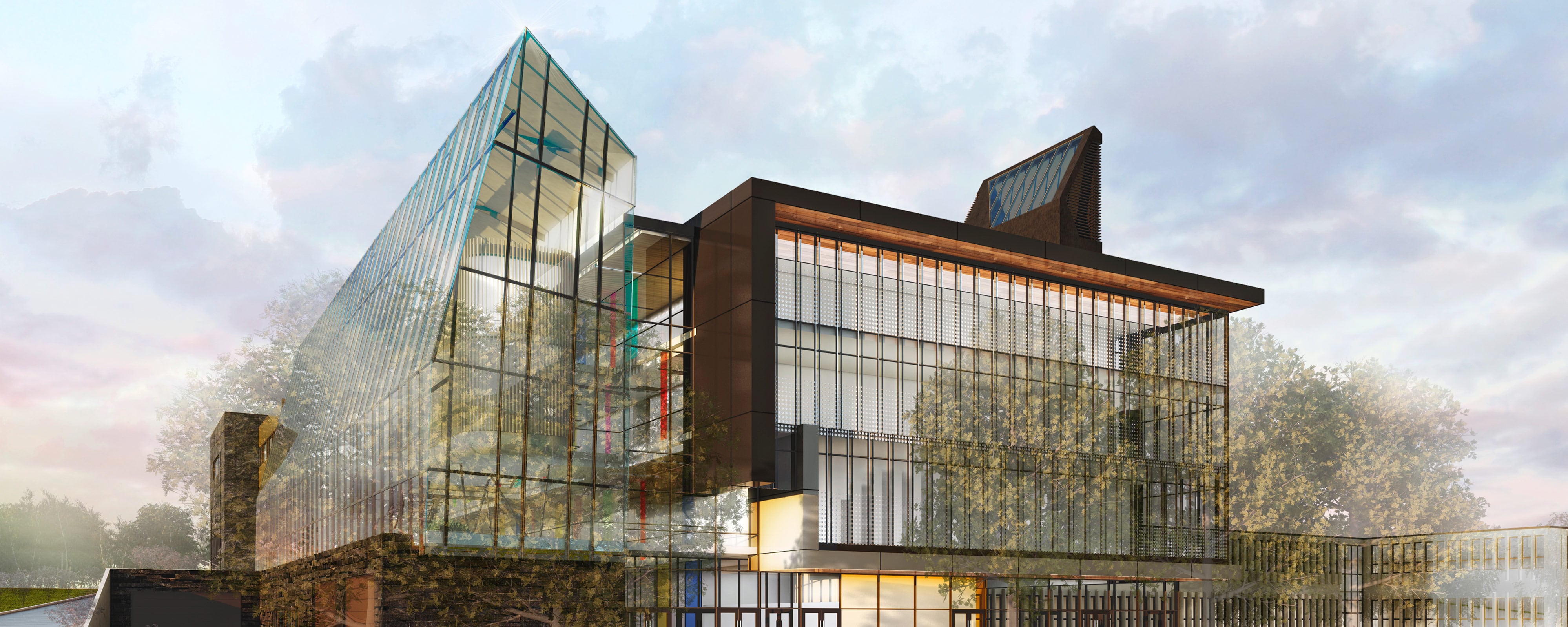 The massing of the building is composed of several major volumes. The most prominent is the Wintergarden. Its glass wall and operable solar curtain animate the south façades, depending on the season and time of the day. The prominent solar chimneys can be seen from many vantage points within the campus, from where they become identifiable icons, echoing the ecologically-minded design of the building. The west façade terminates the Five Minute Walk and begins a path toward the Instructional Centre and Library, which invites students from the residences to the south. Irregular course stone anchors the base of the Wintergarden, while the base of the ‘academic program block’ provides transparency to the cafeteria beyond.