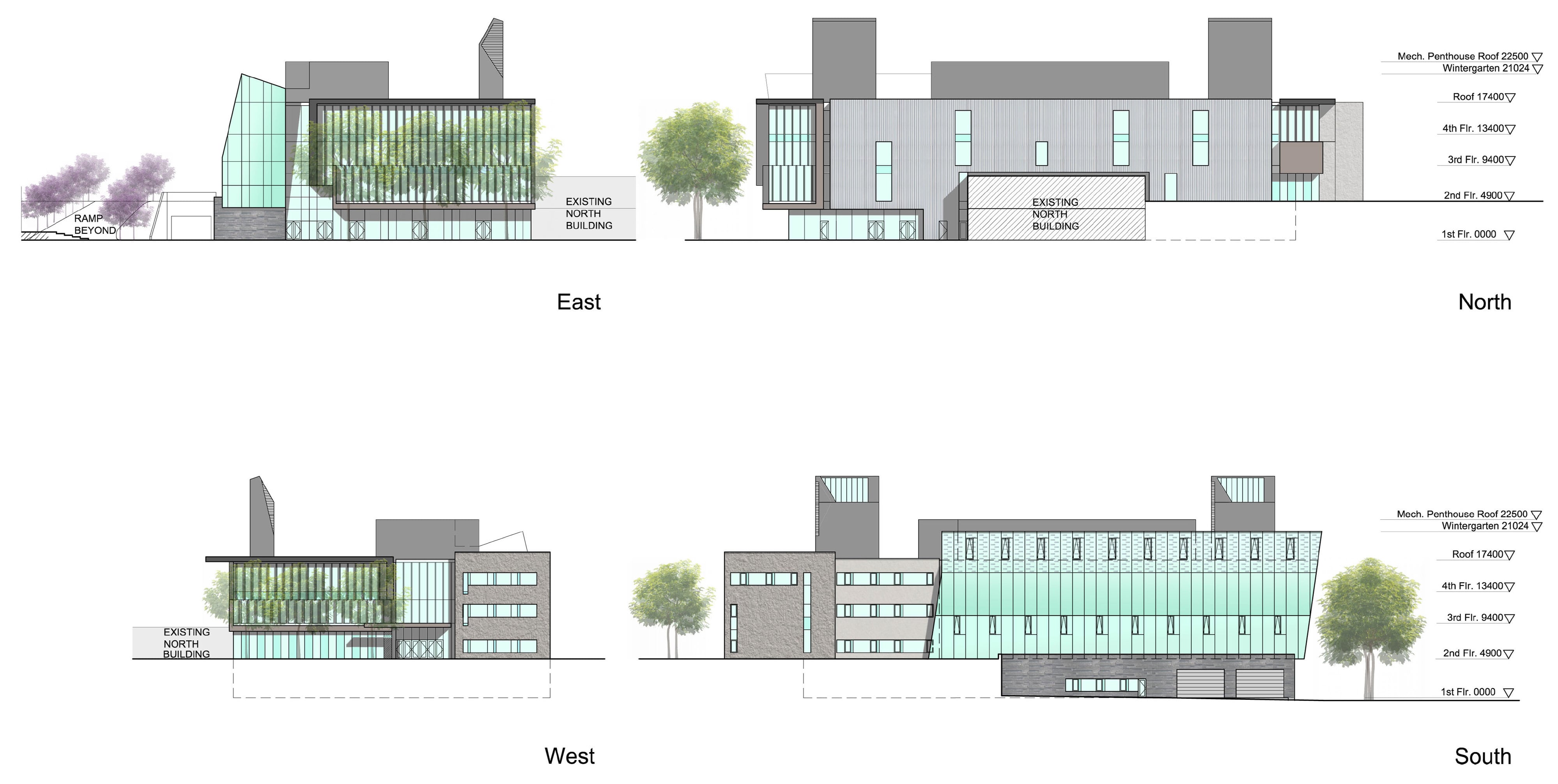 The Outer Circle Road elevation was a tripartite composition. The middle glass volume conveyed the triple height space behind the main front entrance, a prelude to the Wintergarden space beyond. To the south of the main entrance was the ‘classroom block’ of the building, which was to be clad in local manufactured stone panels, while the north portion afforded more windows for faculty offices, for views across Outer Circle Road to the woodlot. The north elevation was deliberately kept utilitarian in nature. Its simplicity and directness were considerations for the future Phase B expansion; the majority of this façade could easily be adapted, modified or removed to receive the next building phase.